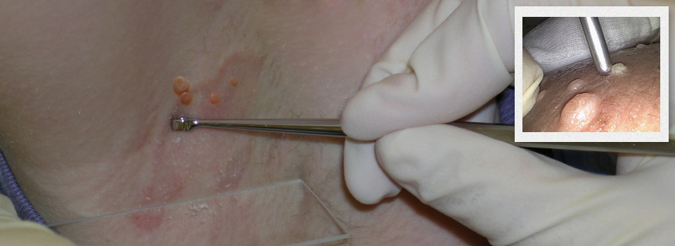 Curettage- Scraping off the lesion and inner waxy head. This procedure may be performed with or without an anesthetic. With children and infants, it may include harnessing to reduce struggling. Scar damage is likely to result of this alternative.